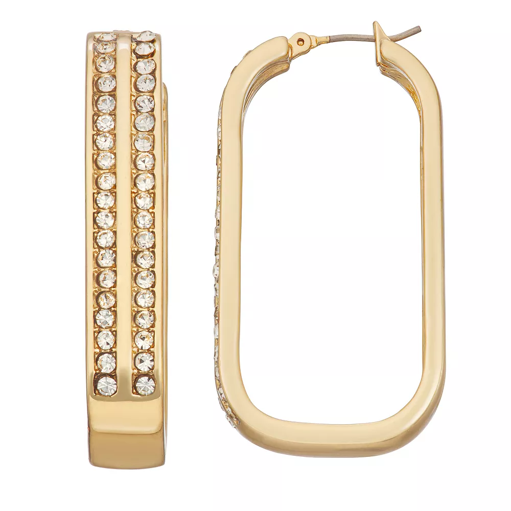 Dazzled with crystal accents, these Nine West gold tone drop hoop earrings will enhance your elegant attire.